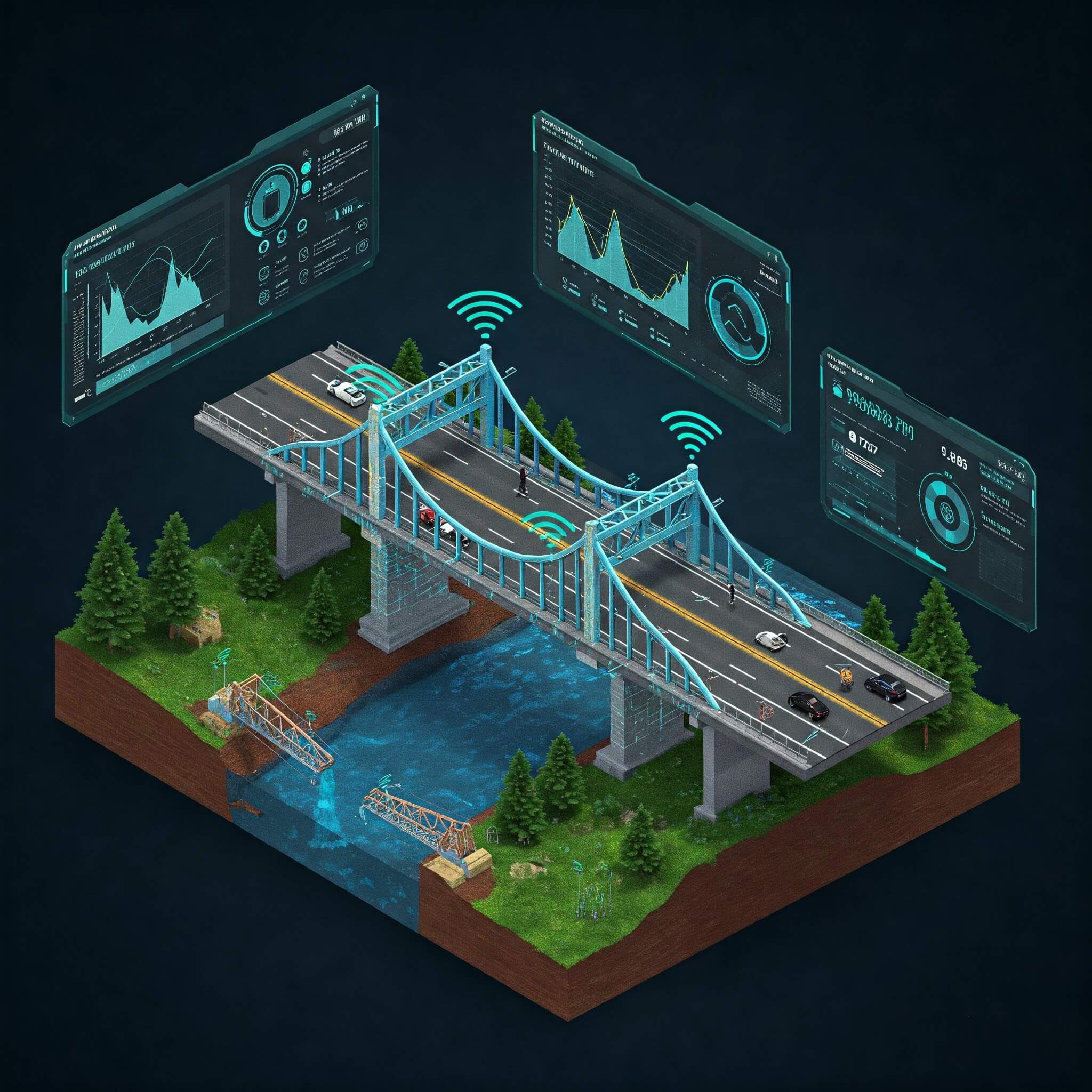 Digital twins are virtual representations of physical assets, processes, or systems that are continuously updated with real-time data. In the context of bridge management, a digital twin serves as a dynamic digital counterpart of a physical bridge, mirroring its structure, behavior, and environmental interactions. This virtual replica is built using various data sources, including design models, building plans, inspection reports, sensor data, and historical records. The sensors, acting as the "eyes and ears" of the twin, continuously collect data on vibrations, stress levels, material conditions, wind speeds, temperature changes, and other critical parameters.